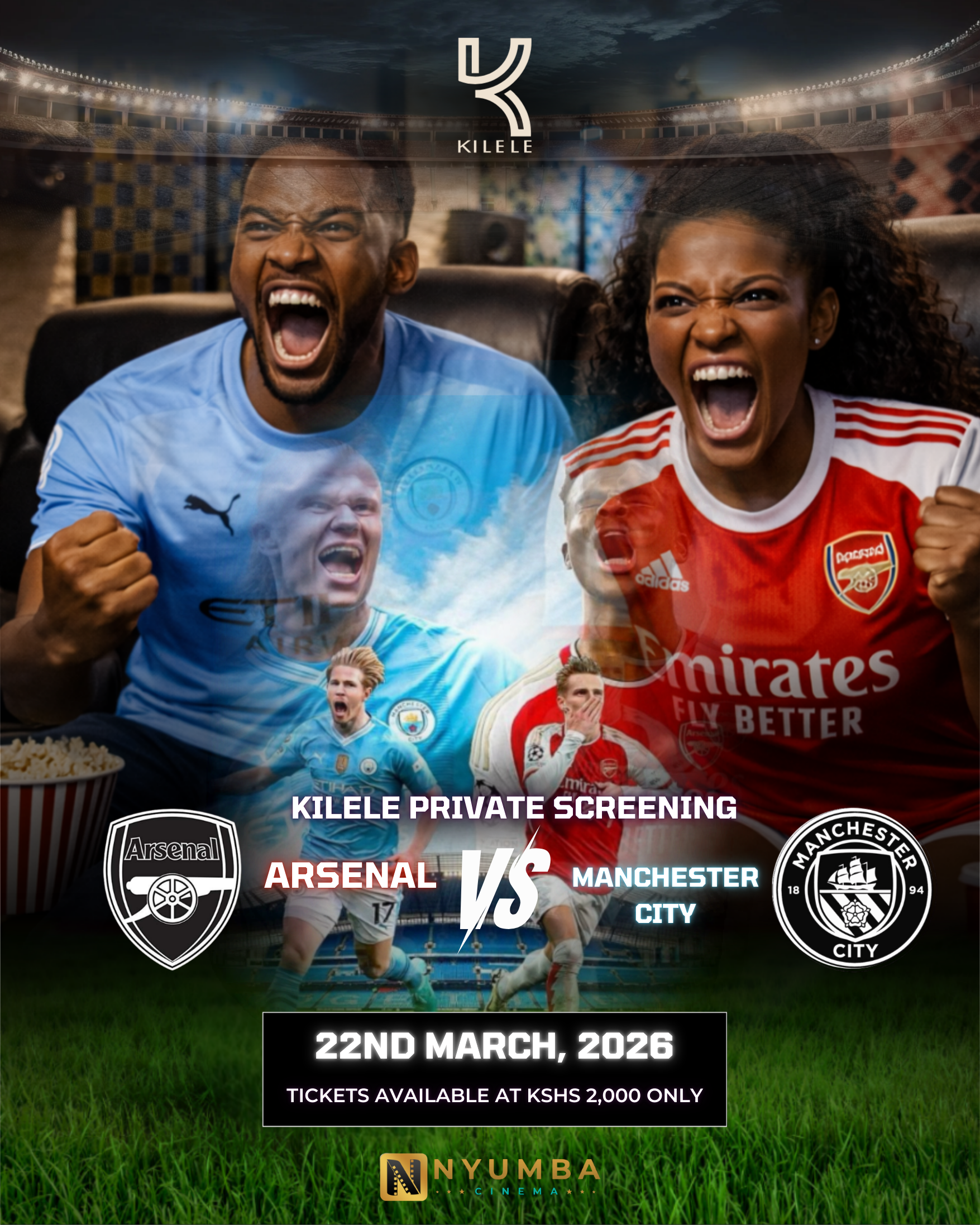 Football deserves to be experienced not just watched. On 22nd March, Kilele hosts an exclusive private screening of Arsenal vs Manchester City, two giants, one screen, and an atmosphere every football lover understands. Feel every goal, every moment, and every roar of the room. Date: 22nd March 2026 Time: 7:30 PM to 9:30 PM Location: Nyumba Cinema, Rosslyn Riviera Tickets: KSh 2,000 Only 15 seats available. Secure your seat early. Purchase your ticket now.